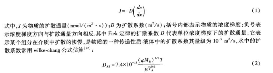 式中,J為物質的擴散通量(nmol/(m2·s));D為擴散系數(m2/s);括號內部表示物質的濃度梯度;負號表示濃度梯度方向與擴散通量方向相反。其中Fick定律的擴散系數D代表單位濃度梯度下的擴散通量,它表示某個組分在介質中擴散的快慢,是物質的一種傳遞性質。液體中的擴散系數其量級為10-9m2/s,水中的擴散系數常用wilke-chang公式估算: