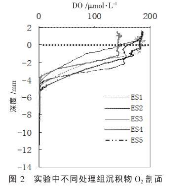 圖2顯示,由于底棲生物作用、底棲生物和物理擾動的協同作用、藻類光合作用,導致沉積物微環境氧發生明顯變化。其中,對照組(ES1)、搖蚊幼蟲組(ES2)、組合擾動組(ES3)、河蜆組合擾動組(ES4)和藻類組合擾動組(ES5)對應的溶解氧滲透深度OPD分別為:5.1、6.8、10.2、8.0和11.5 mm。由此可見,ES1、ES2和ES3這3組的變化規律符合前人研究結果表明:三組中組合擾動組OPD最大,并依次大于搖蚊幼蟲組和對照組(各處理組的氧剖面是對該沉積物柱樣表層隨機選取一點做穿刺測定的,在選點時避開了水絲蚓所打的蟲洞,因此剖面具有相對一般性)。當河蜆或藻類出現時,沉積物OPD明顯產生不同變化。與組合擾動組相比,河蜆的出現降低了沉積物OPD,而藻類的出現進一步增大了沉積物OPD。