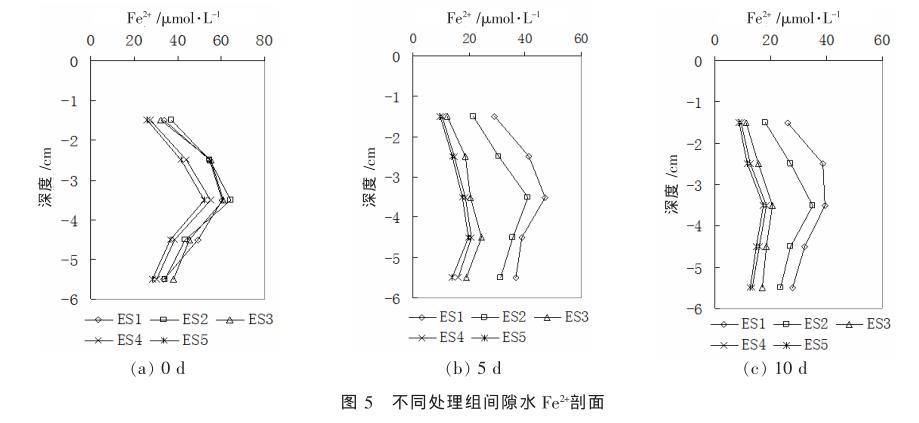 圖5不同處理組間隙水Fe2+剖面