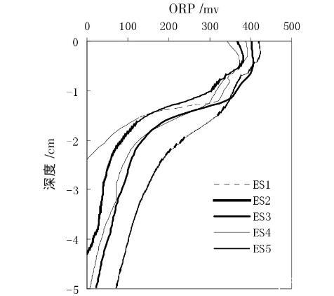 圖4顯示,各處理組沉積物的ORP在表層0~1.3 cm緩慢降低,在1.3~2 cm呈現(xiàn)迅速遞減趨勢,之后緩慢降低直至降到0 mv左右(由于微電極能夠尖端細(xì)部進(jìn)入沉積物的長度只有5 cm,所以深度在5 cm以下的沉積物ORP無法測量);同時,組合擾動組ORP明顯依次大于搖蚊幼蟲組和對照組,河蜆的出現(xiàn),使得ORP降低,而藻類的出現(xiàn)使ORP進(jìn)一步增大,這與圖2結(jié)果相吻合。同時,ES1、ES2、ES4、ES3、ES5的ORP剖面從左向右平移,ORP增加的區(qū)域沿垂向上呈現(xiàn)逐漸擴(kuò)張的趨勢。