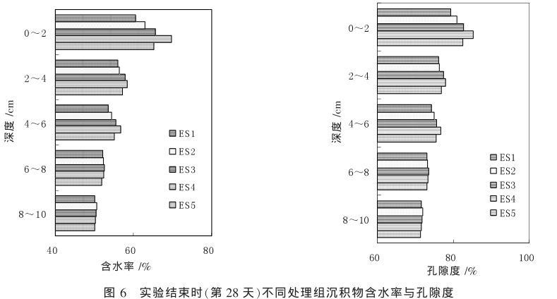 各處理組柱樣6~10 cm范圍內(nèi),同一深度沉積物含水率與孔隙度幾乎相等、其中ES1、ES2、ES3、ES4、ES5表層0~6 cm沉積物含水率均值分別為56.65%、57.92%、59.69%、61.68%和59.16%;而表層0~2 cm沉積物含水率分別為60.54%、62.93%、65.54%、69.81%和65.28%。