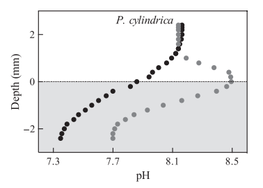 圖5、在對照pCO2-溫度情景下測量的P.cylindrica骨骼內pH的深度剖面(200μm步長),分別在黑暗(0μmol量子/m2·s=黑色圓圈)和光照條件下(900量子/m2·s=灰色圓圈)。實驗流速約為0.02 L/s。水平虛線標記骨骼表面(0 mm深度),灰色區域對應于骨骼內部的測量(從0到2.4 mm),白色區域代表體積海水(從0到2.4 mm)。