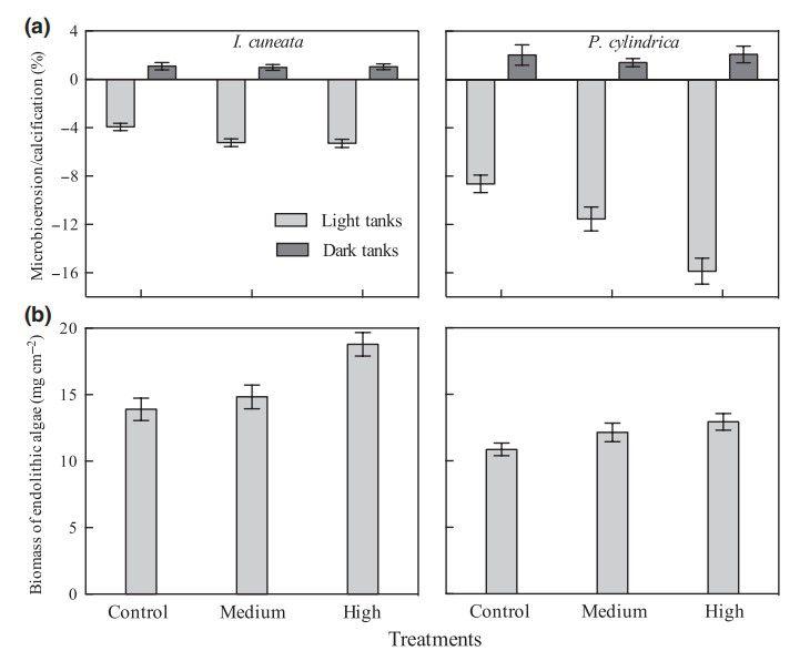 生物介導的碳酸鹽溶解是珊瑚礁生態系統遭受破壞的重要組成部分。雖然海洋酸化可以增加碳酸鹽基質的溶解,但海洋酸化與升溫對珊瑚骨骼微生物侵蝕的綜合影響尚不清楚。在本研究中將建造珊瑚(Porites cylindrica和Isopora cuneata)的骨骼暴露于現今(對照:400μatm–24°C)和未來二氧化碳濃度-溫度情景(中等:+230μatm–+2°C;高:+610μatm–+4°C)。骨骼還在完全黑暗中經歷了初始的次氯酸鈉浸泡和自然光下沒有次氯酸鈉浸泡,以隔離酸性海水的環境效應(即,Ωaragonite<1)與光合微生物的生物效應。結果表明,骨骼的溶解主要由光合微生物驅動,因為在黑暗中保持的樣本并未發生去鈣化。相反暴露于光下的骨骼在升高的二氧化碳-溫度情景下溶解率增加,P.cylindrica在高處理下的月溶解率(89%)高于I.cuneata(46%)。未來的二氧化碳-溫度情景對內生群落結構的影響僅在P.cylindrica中被識別,主要與綠色藻類Ostreobium spp.的豐度增加相關。增強的骨骼溶解也與升高的二氧化碳-溫度情景下內生生物量和呼吸作用的增加相關。
