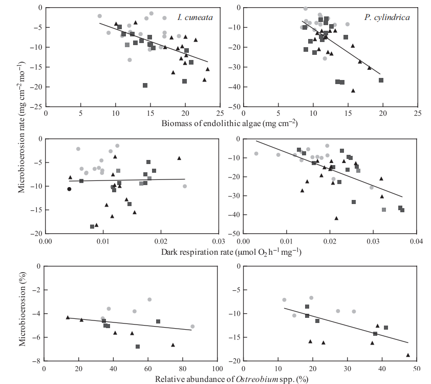 圖4、Isopora cuneata和Porites cylindrica骨骼的微生物侵蝕與內生藻類的不同變量之間的關系。兩種類型的骨骼都暴露于三種pCO2-溫度情景(對照=圓圈;中等=方塊;高=三角形)。完整的數據集被繪制并由實線表示。微生物侵蝕率(mg/cm2·月)與內生藻類的生物量(mg/cm2)之間的關系對于I. cuneata(R2 = 0.3094,P < 0.001)和P. cylindrica(R2 = 0.3560,P < 0.0001)。對于I. cuneata,中等和高情景的回歸在統計上顯著(R2 = 0.4009,P < 0.05 和 R2 = 0.3219,P < 0.05),而對于P. cylindrica(R2 = 0.2904,P < 0.05 和 R2 = 0.4790,P < 0.01)。微生物侵蝕(%)與Ostreobium spp.的相對豐度(n = 5個水箱)之間的關系,對于I. cuneata(R2 = 0.0696,P ns)和P. cylindrica(R2 = 0.3869,P < 0.05)。