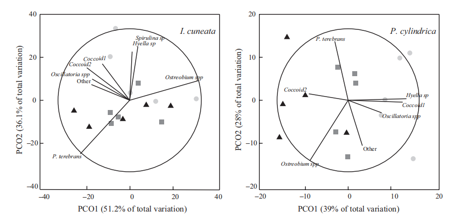 圖3、在三種pCO2-溫度情景下,內生群落的響應的主坐標排序(PCO)(對照=圓圈;中等=方塊;高=三角形)在Isopora cuneata和Porites cylindrica的珊瑚骨骼中。pCO2-溫度處理對應于當前條件(對照:約400μatm-24°C)和兩種IPCC預測情景(中等/B2情景:+230μatm+2°C和高/A1FI:+610μatm+4°C)。兩個PCO軸解釋的方差的高百分比表明良好的二維排序。與兩個軸最好相關的分類群的斯皮爾曼相關系數(僅顯示R>0.5)作為矢量覆蓋顯示。