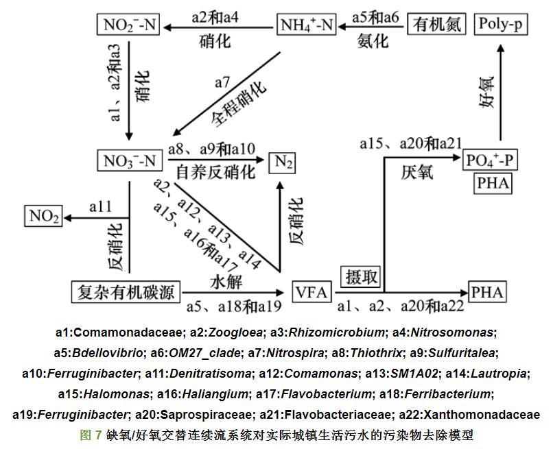 結合功能菌群的分類結果,建立缺氧/好氧交替連續流系統對實際城鎮生活污水的污染物去除模型如圖7,首先生活污水中的復雜有機物首先通過Ferribacteriu屬和Ferruginibacter屬水解為VFA.污水中的氮分為有機氮和無機氮,污水中的有機氮通過Bdellovibrio屬和OM27_clade屬的氨化作用分解含氮有機化合物釋放NH4+-N,這些細菌具有循環利用有機氮的作用,其中OM27_clade屬隸屬于球孢菌科(Bdellovibrionaceae)的OM27進化枝成員,是未經培養的微生物群。污水中的NH4+-N通過Zoogloea屬及Nitrosomonas屬硝化成NO2--N,其由Comamonadaceae科、Zoogloea屬和Rhizomicrobium屬進一步硝化成NO3--N,同時還有全程硝化細菌Nitrospira屬同時擁有氨氧化功能和亞硝酸氧化功能,將NH4+-N硝化成硝氮。緊接著污水中NO3--N反硝化成為N2,在顆粒污泥中發現了幾種反硝化細菌,第一種是利用VFA進行反硝化的細菌,有以VFA中的乙酸為碳源進行反硝化的Halomonas屬和Comamonas屬、也有利用其它VFA進行反硝化的Zoogloea屬、SM1A02屬、Lautropia屬、Haliangium屬和Flavobacterium屬,第二種是自養反硝化細菌,有利用硫基進行自養反硝化的Thiothrix屬和Sulfuritalea屬,也有利用鐵進行自養反硝化的Ferruginibacter屬,第三種是直接利用污水中復雜有機碳源進行反硝化的Denitratisoma屬??梢?,由于實際生活污水中的有機碳大部分以復雜化合物(如蛋白質,脂類和多糖)的形式存在,所以在連續流系統中發現了多種利用不同碳源的反硝化細菌,促進了生活污水中各種碳源的利用。