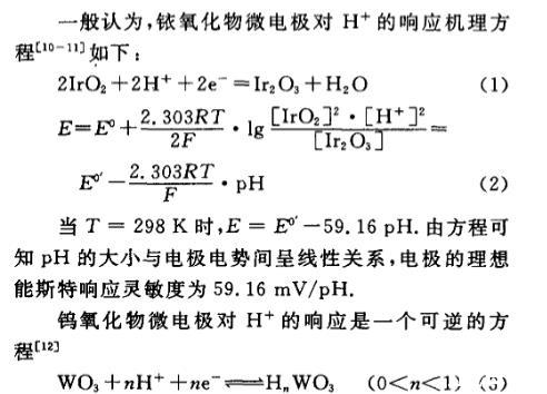 鎢氧化物微電極對H具有良好的響應(yīng)是由于它遵從這樣一個質(zhì)子參與的氧化還原反應(yīng),在這個可逆反應(yīng)過程中,參加反應(yīng)質(zhì)子數(shù)改變了膜中的氧化物的比例,從而改變膜電位,理想能斯特響應(yīng)為59.16mV/pH.