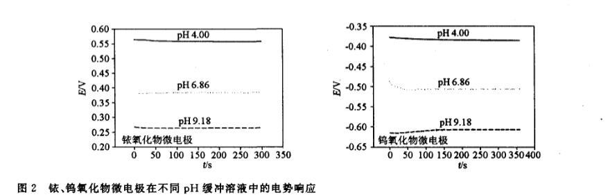 為了測試金屬氧化物電極長時間工作電勢的穩(wěn)定性,在pH 9.18緩沖溶液和自來水(pH一7.12)中連續(xù)測量2h,觀察其電勢變化曲線。結(jié)果表明鎢和銥氧化物微電極在兩種溶液中電勢變化均小于3mV/h.