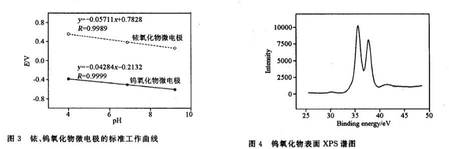 至4h,形成的黑色氧化膜與金屬基底結(jié)合緊密。碳酸鈉熔點851℃,在高溫18oo℃下分解,實驗表明,加熱至850℃,冷卻后的氧化膜也有明顯的粘附現(xiàn)象,因此經(jīng)過實驗調(diào)整,碳酸鈉氧化溫度同樣選擇為80o℃。制備鎢氧化物微電極的氧化溫度選擇在5O0℃,低于碳酸鹽的熔點,但將所制作電極做鎢元素的XPS分析后,從譜圖(圖4)上看,W 4f5,。結(jié)合能為35.7eV,說明金屬表面膜中鎢的確氧化為+6價。