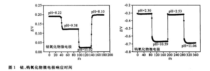 為了測試電極對溶液pH變化的響應(yīng)時間,向標(biāo)準(zhǔn)緩沖溶液,滴加0.1 mol/L HCl或O.1 mo1/LNaOH調(diào)節(jié)以獲得pH值跳躍,測量電勢達到90終點值的時間。。圖1表明鎢氧化物微電極的Tg。為8s,銥氧化物微電極比鎢氧化物微電極響應(yīng)速度更快,。均小于5s.