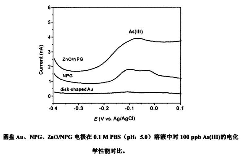 本論文主要以氧化鋅納米顆粒以及納米多孔金作為分析檢測三價砷的敏感材料。氧化鋅納米顆粒具有高比表面積、高孔隙率以及良好的穩(wěn)定性,為三價砷的檢測提供了大量的吸附位點,提高了電極的吸附性能;納米多孔金增加了電極的活性面積且具有較高的催化活性促使電極表面的反應能夠快速發(fā)生,提高金微電極檢測三價砷的效率。結果表明,兩種納米材料修飾的金微電極在近中性條件下檢測三價砷取得了良好的效果,為今后進一步研究納米材料功能化微電極奠定了基礎。本論文具體研究工作如下:一、原位合成氧化鋅納米顆粒修飾納米多孔金微電極(ZnO/NPG-μE)用于近中性條件下三價砷的檢測:以電化學合金/去合金方法構建多孔金微電極的過程中伴隨著鋅的電化學沉積并在電極表面形成金鋅合金,通過控制循環(huán)過程中的終止電位來調節(jié)電極表面鋅的含量,進一步熱處理可以實現(xiàn)金鋅合金在納米多孔金表面原位形成ZnO納米顆粒。