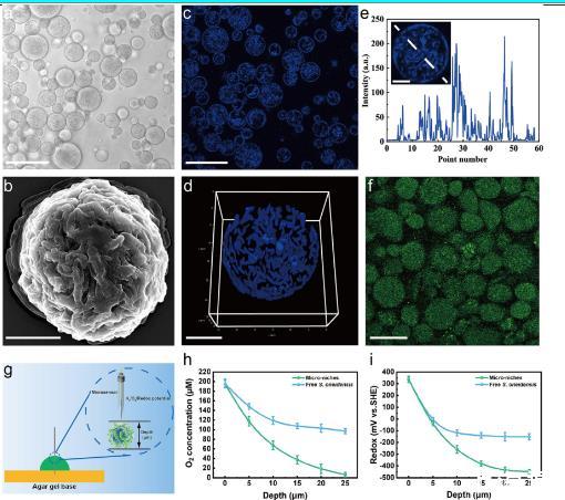 圖2、基于奧奈達湖桿菌的球形微生態位的形成。(a)使用1 mL 1%海藻酸鈉和1 mL奧奈達湖桿菌細胞懸液形成的微生態位的光學顯微鏡圖像(OD 600=4.0,109細胞/mL),比例尺,50μm。(b)單個球形微生態位的SEM圖像,顯示奧奈達湖桿菌細胞封裝在基于藻酸鹽的基質中,比例尺,10μm。(c,d)微生態位的2D(c)和3D(d)共焦掃描圖像,顯示整個微生態位中存在DAPI標記的奧奈達湖桿菌細胞;激發波長為405 nm,比例尺分別為50μm和10μm。(e)單個微生態位上的藍色熒光強度圖。插圖顯示相應的共焦掃描圖像,染色如(d)所示,比例尺,10μm。(f)含有[Ru(dpp)3]Cl2氧指示劑的微生態位的熒光圖像;激發波長為488 nm,比例尺為40μm。(g)在單個微利基中基于氧微電極傳感器的測量的示意圖。使用瓊脂作為基底來保護電極。(h)微生態位內不同深度的O2濃度。(i)微生態位和游離奧奈達湖桿菌細胞的氧化還原電位曲線。