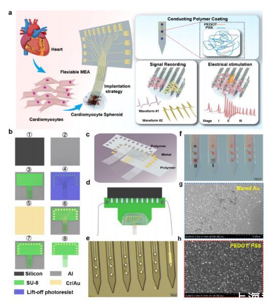 圖1:整合的3D心肌細胞生物傳感和調節系統的建立和表征。(a)PEDOT:PSS涂層在有機柔性微電極陣列上的示意圖,用于通過直接植入策略對3D心肌細胞凝膠球體進行電生理檢測和刺激。(b)OFI-MEA器件的微細加工工藝流程。①硅片已清潔。②濺射100nm厚的Al。③研制了20μm SU-8。④負性光刻膠在金屬層上形成圖案。⑤磁控濺射150 nm Cr/Au。⑥金屬層是通過剝離工藝實現的。⑦開發了5μm厚的SU-8作為頂部介電層。⑧Al層被腐蝕以釋放器件。(c)OFI-MEA裝置的拆卸圖。(d)組裝好的OFI-MEA裝置圖。(e)OFI MEA裝置的布局。(f?h)在沒有或有PEDOT:PSS的情況下對Au微電極進行改性。(g,h)Au和PEDOT:PSS修飾電極的掃描電鏡圖像,分別對應于圖1f(i)和(ii)。比例尺:2μm。