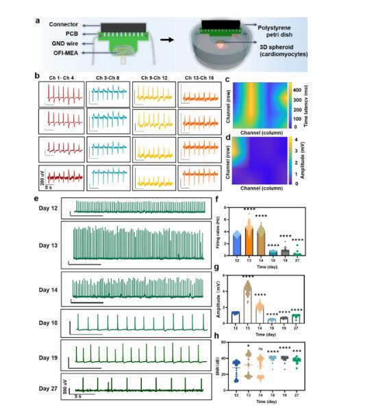 圖3:在生長過程中,對3D心肌細胞凝膠球體中的電生理信號進行高通量時空檢測和長期記錄。(a)示意圖顯示了在球體發育過程中將3D心肌細胞凝膠球體連接到OFI-MEA和生物傳感系統進行電生理學的設置。(b)在培養的第25天,從3D心肌細胞凝膠球體記錄了16個通道電壓軌跡。(c)電生理信號的信號傳播圖顯示了峰值時間的延遲。(d)電生理信號的熱圖顯示了16個通道的平均振幅差異。(e)在生長的第12、13、14、18、19和27天,3D心肌細胞球體的電生理記錄中的代表性電壓軌跡。(f)三維心肌細胞球體不同天數的信號放電率分析、(g)振幅分析和(h)信噪比分析(單因素方差分析)。