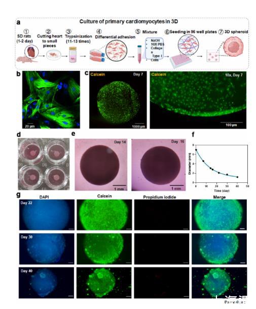 圖2:三維心肌細胞凝膠球體培養和表征。(a)3D中原代心肌細胞的培養過程。(b)免疫熒光染色顯示了培養4天的原代心肌細胞的形態特征。細胞用cTnT(綠色)染色,而細胞核用DAPI(藍色)染色。(c)將3D心肌細胞凝膠球體的全局和局部實時染色圖像培養7天。活細胞用鈣黃綠素標記。(d)15天培養期后的3D心肌細胞凝膠球體的圖像(e),以及在96孔板中培養14天和16天后的球體的亮場顯微鏡圖像。(f)三維心肌細胞球體直徑時間依賴曲線。(g)培養22、30和40天形成的3D心肌細胞凝膠球體的代表性活/死圖像。鈣黃綠素染色活細胞,碘化丙啶(PI)標記死細胞,DAPI染色細胞核。比例尺:200μm。