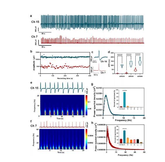 圖4:OFI-MEA的長期多通道電生理信號記錄和時頻分析。(a)使用OFI MEA記錄培養18天的3D心肌細胞凝膠球體的代表性連續延長電生理信號(Ch 15,Ch 7)。(b)400秒內記錄的電生理信號(Ch 15、Ch 7)的振幅。(c)兩種信號的典型波形。(d)記錄的電生理信號的平均APD30、APD50和APD90(Ch 15、Ch 7)(單因素方差分析)。(e)電生理信號(Ch 15)的原始軌跡(20秒,頂部)和時頻譜(0?20 Hz,20秒,底部),色階:頻譜(μV2)。(f)電生理信號(Ch 7)的原始軌跡(20秒,頂部)和時頻譜(0?60 Hz,20秒,底部),色階:頻譜(μV2)。(g)電生理信號(Ch 15)的功率譜密度(PSD)分析和頻譜分布檢查(單因素方差分析)。總體功率譜主要集中在δ頻帶(0.5?4 Hz)內。(h)電生理信號(Ch 7)的功率譜密度(PSD)分析和頻譜分布檢查(單因素方差分析)。顯示了七個頻帶的總體功率譜分布:<0.5 Hz、δ(0.5?4 Hz)、θ(4?8 Hz)、α(8?14 Hz)、β(14?30 Hz)、γ(30?120 Hz)和ε(>120 Hz)頻帶。