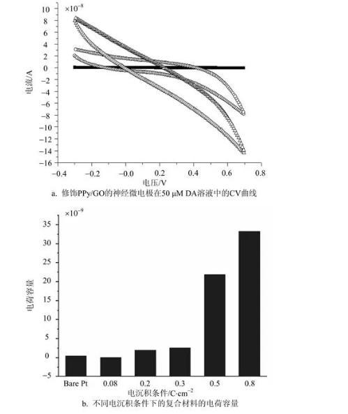 不同電量密度電聚合成的PPy/GO有不同的電化學(xué)性質(zhì)。圖4a為修飾有PPy/GO的神經(jīng)微電極在50μM DA溶液中的伏安響應(yīng),其中包括裸Pt電極,使用0.3 C/cm2和0.8 C/cm2電量密度修飾的神經(jīng)微電極的循環(huán)伏安曲線(CV曲線),Bare Pt—(■),0.3 C/cm2—(○),0.8 C/cm2—(△),分別為PPy/GO的電沉積條件。圖4b為不同電沉積條件下的復(fù)合材料的電荷容量。對于采用循環(huán)伏安法獲得的CV曲線的電荷容量為: