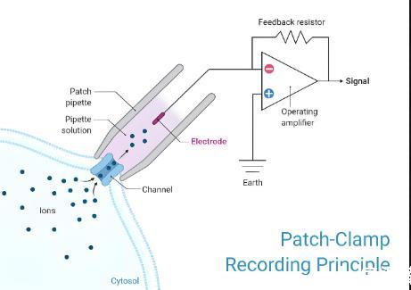 用一個尖端直徑在1.5~3.0μm的玻璃微電極接觸細胞膜表面,通過負壓吸引使電極尖端與細胞膜之間形成千兆歐姆以上的阻抗封接,此時電極尖端下的細胞膜小區域(膜片,patch)與其周圍在電學上分隔,在此基礎上固定(鉗制,Clamp)電位,對此膜片上的離子通道的離子電流進行監測及記錄。