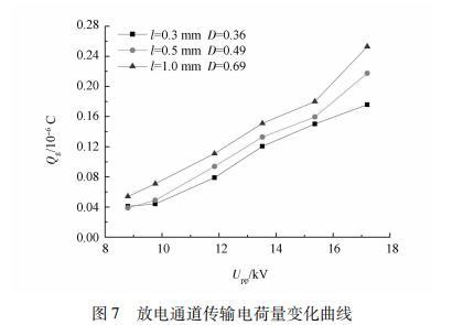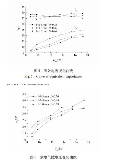 通常認為實驗電介質具有理想電容性,且真空和無損極化條件下的電流密度均為理想電容性,則放電氣隙電壓可近似為常量。根據Lissajous圖形得到的測量電容和前面計算的等效電容可推導出Q。和Q.,。又根據u=u。一(Q一Q)/C,進而可計算出放電氣隙電壓u,如圖6所示。其中Q、Q和u分別為放電熄滅時刻C、C上的積累的電荷量和C兩側的電壓。從圖6中可以看出,隨著的增大,放電氣隙電壓也隨之逐漸增大,但增長趨勢呈現平緩;在f/一定時,隨著,J的變大,也不斷增大,且微腔尺寸D為0.69對應的U總是高于其他兩種微腔結構電極,保持較大。經實驗發現,這是受放電通道內的電荷密度及產生的表面低溫等離子體面積影響造成的。