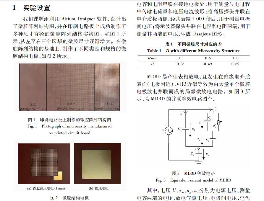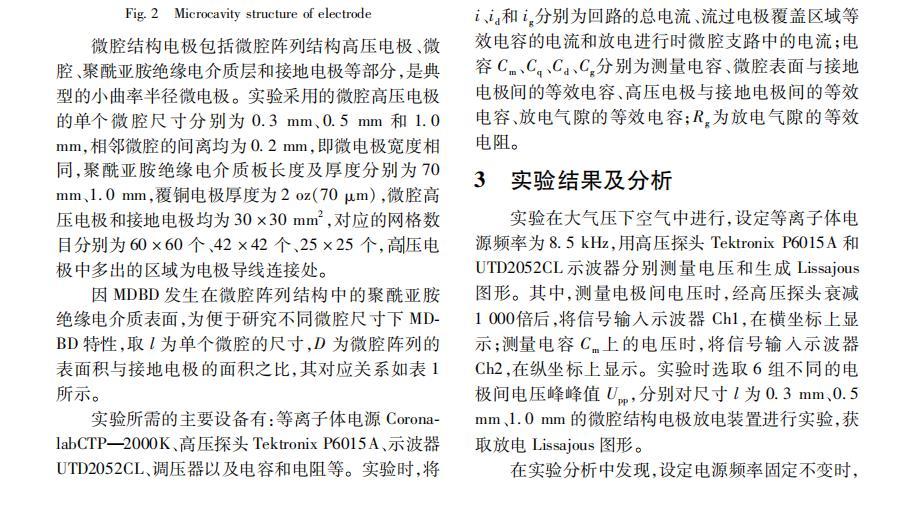 目前本研究領域尚未達成共識,沒有形成統一理論。研究不同高壓電極下介質阻擋放電的特性,以及改進常規制取低溫等離子體的高壓電極結構,具有重要的理論意義和工業應用價值。為進一步實現降低放電起始電壓,充分利用電暈放電的預電離作用,產生數量較多、分布較均勻的非平衡態低溫等離子體,本文設計并制作了一種新型的微腔結構電極,并利用制作的不同類型和規格的微電極,設計實驗研究裝置,建立等效電路模型,根據獲得的Lissajous圖形分析不同尺寸微腔下的電壓電流波形、電極間的等效電容、放電氣隙電壓、半個周期放電通道傳輸的電荷量、平均放電功率以及電介質表面功率密度等參量的變化情況,研究微腔介質阻擋放電(microcavity dielectric barrierdischarge,MD—BD)。
