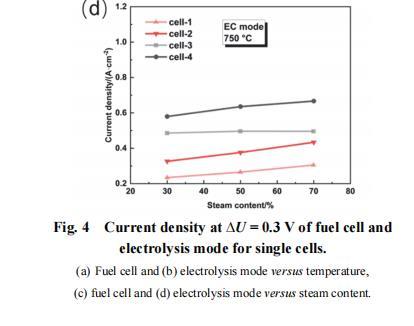 從圖3和圖4中可以看出,通過增大氫電極孔隙率可以顯著提升單電池性能,在750°C、50%H2O和0.3 V偏壓下,cell-1相比cell-3的SOFC發(fā)電電流密度從0.546 A?cm?2增大到0.649 A?cm?2,SOEC電解電流密度從0.263 A?cm?2增大到0.495 A?cm?2;采用致密薄膜GDC隔離層進一步降低了cell-4單電池歐姆阻抗,發(fā)電電流密度增加至0.752A?cm?2,電解電流密度增加到0.635 A?cm?2。結果表明,增大氫電極孔隙率及降低歐姆阻抗對于電解模式的性能提升明顯大于發(fā)電模式,在750°C、50%H2O和0.3 V偏壓下,cell-4相比cell-1的發(fā)電電流密度僅提升了~37%,而電解電流密度則提升了~140%。在其他溫度及水分壓等工況下,均具有相似的現(xiàn)象。