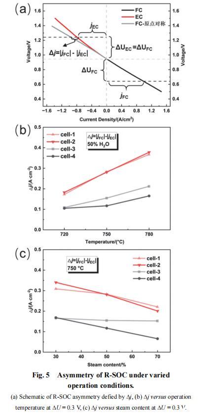 從圖5c中可以看出,R-SOC不對稱性隨水分壓升高而減小,說明在氫電極支撐單電池中,電解性能較差依舊是導致不對稱性的主要原因。通過提升氫電極孔隙率,同時采用小歐姆阻抗電解質體系能夠明顯降低該不對稱性。