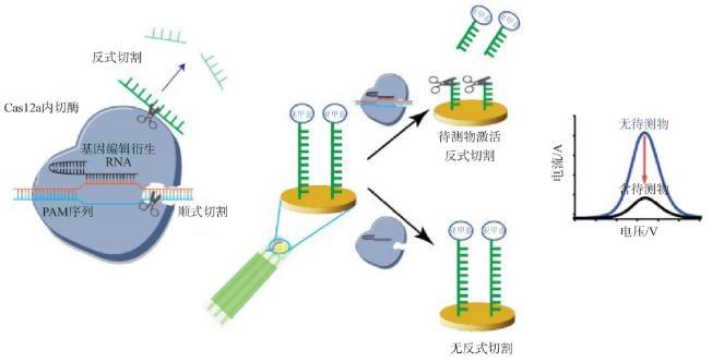 DAI等發現,具有反式切割活性的Cas12a核酸內切酶可對單鏈DNA啟動反式切割,將標記有亞甲基藍的單鏈DNA固定在金電極電化學傳感器,在待測物存在的條件下,Cas12acrRNA可啟動對非特異性單鏈DNA的反式切割,使亞甲藍的電流降低;基于這一發現,他們開發了一種基于CRISPR Cas12a(cpf1)的電化學生物傳感器——E-CRISPR,為了證明其系統通用性,他們將開發的E-CRIPSR首次應用于人乳頭瘤病毒和細小病毒B1916核酸檢測,結果顯示,由于優化了Cas12a體外反式切割的化學環境,無需任何酶促進擴增,E-CRISPR達到了皮摩爾水平的檢測限;他們進一步設計了基于E-CRISPR級聯的蛋白質靶點,用于檢測臨床樣本中的轉化生長因子-β1蛋白。相信在電化學和CRISPR的結合下,E-CRISPR可以成為便攜、精準和低成本的即時診斷系統的強大推動力。E-CRISPR的檢測原理見圖3。