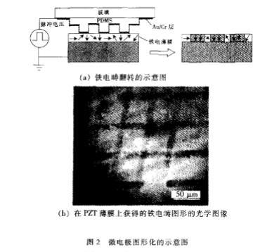 鐵電疇翻轉最直接的方法是采用傳統的電極。為獲得預定圖形的鐵電疇,需要采用相應圖形的微電極與表面接觸,并施加合適偏壓,產生高于襯底材料矯枉場的電場,使鐵電材料極化。微電極圖形化方法中關鍵的是微電極的制作。針對鐵電刻蝕的需要,D.A.Bon~ell等人Lj開發了一種圖形化的印章電極的制備工藝:首先采用微細加工技術制備所需圖案和尺寸大小的模具,然后把液體聚合物如聚二甲基硅氧烷(PDM S)注入模具,硬化后去除模具,最后在聚合物表面熱蒸發沉積金屬薄膜。印章電極是可移動的,使用方便,并且可以多次利用。盡管在整個印章表面沉積了金屬,但只有那些與鐵電表面接觸的區域才會產生足夠高的電場使鐵電疇翻轉。圖2所示為采用印章電極極化Pb(Zr,Ti)O,(PZT)薄膜過程的示意圖和獲得的鐵電疇圖形的光學像。該方法中鐵電疇的翻轉機制與傳統平行板電極下鐵電疇重新取向相同,即新疇在界面的成核生長。圖2中鐵電疇圖形的尺寸較大,但證實了印章電極在鐵電疇翻轉中的有效性。