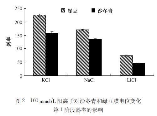 圖2 100 mmol/L陽離子對沙冬青和綠顯膜電位變化第1階段斜率的影響