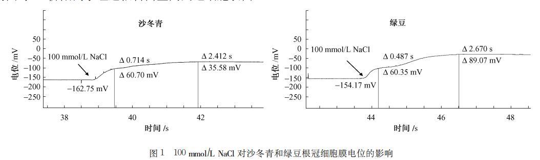 對于同一陽離子、不同濃度而言,在膜電位變化的第2個階段,即離子跨膜轉運過程中所引起的膜電位變化階段,沙冬青和綠豆去極化的斜率隨著鹽處理濃度的增加也表現出較大的差異。以不同濃度下NaC1處理為例(見圖3)。