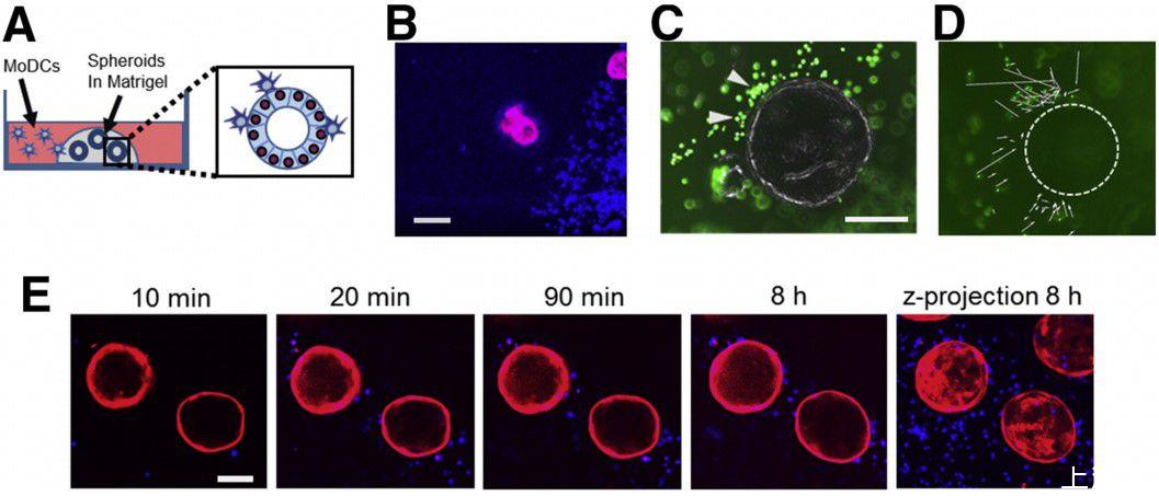 圖1、MoDC與胃上皮細(xì)胞球體共培養(yǎng)后會(huì)自發(fā)遷移到胃上皮細(xì)胞的基外側(cè)。(A)DC-上皮球體共培養(yǎng)模型的圖示。(B)代表性培養(yǎng)板底部的熒光共聚焦圖像顯示了積聚細(xì)胞的Matrigel邊界。藍(lán)色,CellTracker DeepRed標(biāo)記的DC;紅色,表達(dá)mCherry的球形細(xì)胞。標(biāo)尺:200μm。(C)具有代表性的胃球體,周圍有CellTracker Green標(biāo)記的MoDCs。相位對(duì)比圖像與綠色熒光圖像的合并。箭頭表示累積的MoDCs。比例尺:200μm。(D)對(duì)延時(shí)圖像的粒子追蹤分析顯示,DC軌跡指向球體。虛線表示球體的位置。圖像由EVOS FL Auto系統(tǒng)以10倍物鏡采集,代表4個(gè)獨(dú)立實(shí)驗(yàn)。(E)表達(dá)mCherry的胃球體和細(xì)胞追蹤DeepRed標(biāo)記的MoDCs(藍(lán)色)的延時(shí)共焦成像顯示MoDCs被快速募集到球體中。共培養(yǎng)開始后不同時(shí)間點(diǎn)獲得的單張圖像和8小時(shí)后獲得的50張切片的Z疊投影(右圖,步長10μm)。