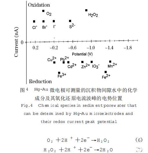圖4 Hg-Au微電極可測量的沉積物間隙水中的化學(xué)成分及其氧化還原電流波峰的電勢位置