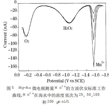 圖5 Hg-Au微電極測量M n2+的方波伏安標準工作曲線,M n2+在海水中的濃度依次為25,50,100和200μm ol/L