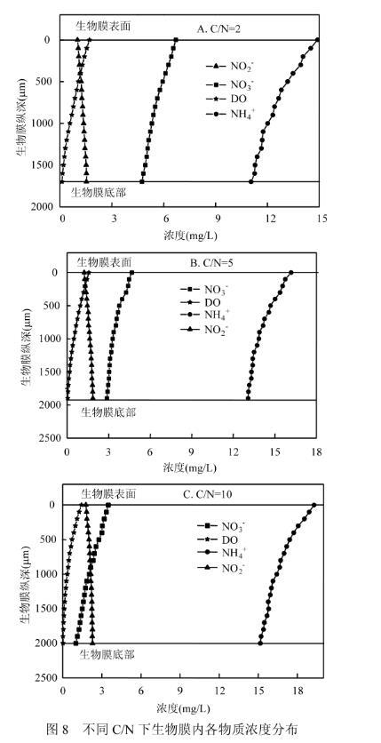比較圖8中3個圖可以得到:在不同C/N比條件下,各物質(zhì)濃度在生物膜內(nèi)的變化趨勢并沒有不同,但是各物質(zhì)濃度有較大的差別。C/N=2時,存在好氧區(qū)和厭氧區(qū),幾乎不存在缺氧區(qū),C/N=5和C/N=10時距離生物膜底部分別出現(xiàn)400μm和500μm的缺氧區(qū),這是由于提高了水相中的COD濃度,促進了生物膜內(nèi)微生物的生長,一方面加快了的DO的消耗,另一方面增加了生物膜厚度,阻礙了DO的傳質(zhì),從而使得生物膜內(nèi)呈現(xiàn)出上部好氧底部缺氧的分布。