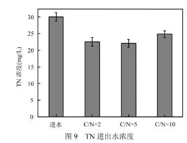 本實驗中進水TN濃度為30mg/L,出水TN濃度分別為22.50,22.11,24.84mg/L,TN去除率分別為25%、26.3%和17.2%.可以看出3種C/N比條件下,TN的去除率都較低,C/N=10時,TN的去除率最低。總氮去除率不高,主要原因是氨氮的硝化過程受到了抑制,C/N比越高,意味著有機負荷高,異養(yǎng)菌大量增殖,成為優(yōu)勢菌種,對氨氧化菌(AOB)產(chǎn)生抑制作用,不利于硝化反應(yīng)的進行,此外在高C/N下,營養(yǎng)物越充分,越有利于微生物的生長,微生物消耗的DO就會越多,導(dǎo)致生物膜內(nèi)DO濃度降低,而硝化反應(yīng)是耗氧的,這也不利于硝化反應(yīng)的進行。