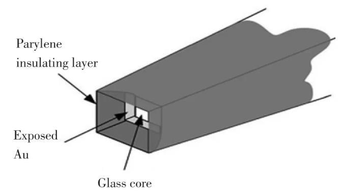 新型微電極探針式氧傳感器(DO MEA),原理如前所述,響應(yīng)時(shí)間更快為15 s,測(cè)定范圍0~9 mg/L。該傳感器有一個(gè)最大的優(yōu)點(diǎn)是探針可以滲透到被測(cè)樣內(nèi)部,故所測(cè)數(shù)據(jù)更精確。為了避免這種傳感器受到選擇性薄膜中物質(zhì)的污染,將探針頭設(shè)計(jì)成為內(nèi)凹陷的,這樣可以獲得更穩(wěn)定的靈敏度以及更快的響應(yīng)時(shí)間,而凹陷面的直徑與長(zhǎng)度是決定該傳感器靈敏度最重要的兩個(gè)因素。圖1是該電極探針頭示意圖。