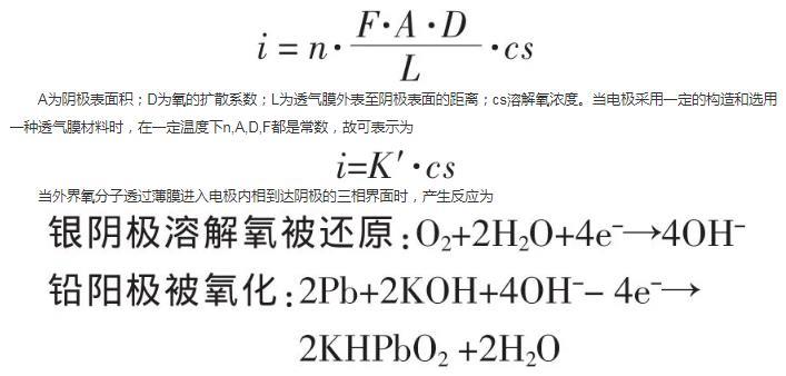 該傳感器電極一般由貴金屬,如白金、金或銀構(gòu)成陰極,由鉛構(gòu)成陽(yáng)極。在電解質(zhì)如KCl或醋酸鉛存在下便形成PbCl2或Pb(AcO)2,原電池型電極無(wú)需外加電壓。電極擴(kuò)散電流的大小可表示為