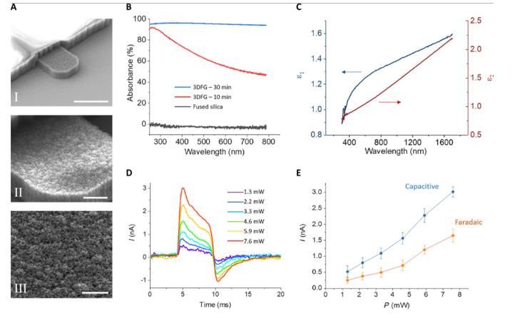 圖1三維多孔金柵(3DFG)的掃描電子顯微鏡(SEM)成像和光學(xué)特性表征。(A)5微米3DFG電極的SEM圖像。比例尺:5微米(I)、1微米(II)和0.5微米(III)。(B)熔融石英(灰色)、在800°C下合成10分鐘的3DFG(紅色)和在800°C下合成30分鐘的3DFG(藍(lán)色)的紫外-可見(jiàn)光吸收率隨波長(zhǎng)的變化。(C)3DFG在可見(jiàn)光和近紅外范圍內(nèi)的介電常數(shù)的實(shí)部(ε1)和虛部(ε2)。(D)在1064納米超快(皮秒)脈沖激光激發(fā)下,3DFG電極與磷酸鹽緩沖液(PBS)界面產(chǎn)生的光電流,激光強(qiáng)度變化時(shí)的情況。脈沖序列持續(xù)時(shí)間為6毫秒。(E)激光激發(fā)產(chǎn)生的光電流的電容分量和法拉第分量。電容值取激光激發(fā)開(kāi)始時(shí)的最大電流峰值。法拉第值計(jì)算為激光脈沖序列結(jié)束前最后1毫秒部分的平均值。