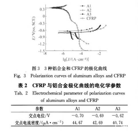表2 CFRP與鋁合金極化曲線的電化學參數