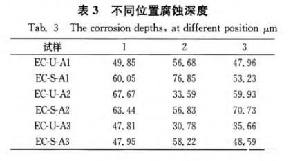 但是兩種表面狀態試樣的年腐蝕率卻沒有明顯的區別,懷疑是兩者的腐蝕深度差異導致這種現象的發生。為了驗證這一推測,對上述六個樣品使用臺階儀測試腐蝕深度,每個樣品選取3個不同位置,每個位置測試3次取平均值,結果如表3所示。
