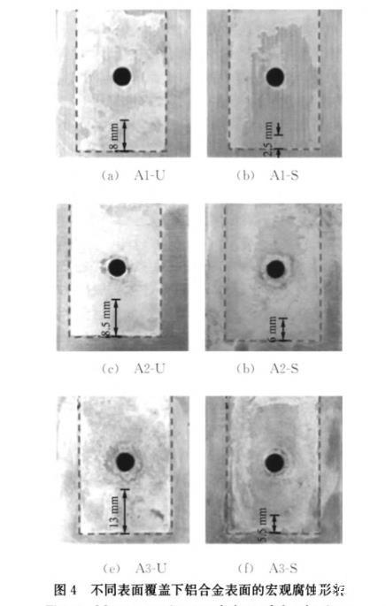 圖4不同表面覆蓋下鋁合金表面的宏觀腐蝕形貌