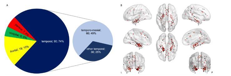 從2010年10月到2020年9月,56名患者(31名女性;年齡:平均33歲,范圍:18至60歲;癲癇病程:平均16年,范圍:4至40年)共植入了122束微電極(每名患者1至4束)。電極大多位于顳葉(n=90;占74%),主要集中在顳葉內側皮質(n=60),包括海馬結構(n=31)、杏仁核(n=14)、海馬旁回(n=6)。微電極也被放置在額葉(n=19,占15%)、頂葉(n=7,占6%)和枕葉(n=6,占5%)(圖6A)。大多數微電極束位于灰質或病變組織中(n=99;占81%),但也有一些分布在白質中(n=4;占3%)或腦實質外區域(n=13;占11%)。在顳葉中,杏仁核的腦實質外區域的微電極比例為6/22,海馬結構為2/44,顳底區域為3/9。