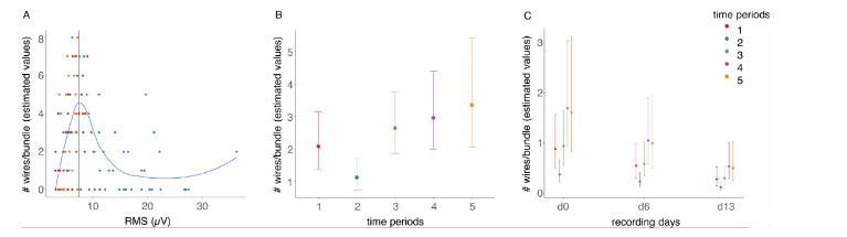 圖8.每束記錄到多單元活動(MUA)的導線數量。A.每束中至少記錄到一次多單元活動的導線數量在整個記錄過程中的情況,與該束所有導線測量的均方根中值的關系。藍色線使用局部平均的局部加權回歸散點平滑法(LOESS)擬合數據。垂直黑線繪制在擬合線的峰值處。B.由廣義線性混合模型(GLMM)得出的每個時間段內每束中至少記錄到一次多單元活動的導線數量的估計邊際均值。條形表示95%置信區(qū)間的下限和上限。C.由廣義線性混合模型(GLMM)得出的每個時間段和記錄天數(0-6-13)中每束中至少記錄到一次多單元活動的導線數量的估計邊際均值。條形表示95%置信區(qū)間的下限和上限。對于所有圖表,每個點代表一束,顏色編碼區(qū)分了5個時間段(紅色:第一時間段,藍色:第二時間段,綠色:第三時間段,紫色:第四時間段,橙色:第五時間段)。時間段之間的顯著差異用星號表示(:0.05