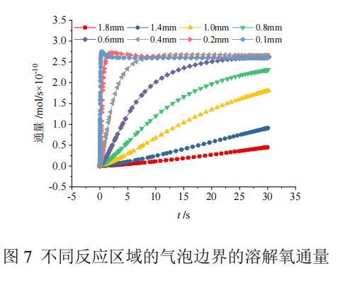 圖6不同反應區域下生長的氣泡的時間系數當電極的反應區域較小時,例如反應區域直徑為0.1 mm,擴散進入氣泡內部的溶解氧通量在2 s后就近似與電極表面產生氧氣分子的通量相等。當反應區域直徑增加至0.4 mm時,氣泡邊界的溶解氧通量在10 s后比直徑為0.1 mm的反應區域的通量仍大一些。超出的通量是由于電解液中過飽和的溶解氧又擴散進入了氣泡。這也是反應區域直徑為0.4 mm的電極表面的氣泡在30 s時生長至與反應區域直徑為0.1 mm的電極表面的氣泡一樣大的原因,如圖5(a)所示。對于反應區域直徑不低于0.8 mm的情況,在30 s內,單位時間進入氣泡內的溶解氧通量一直低于電極表面產生的溶解氧。