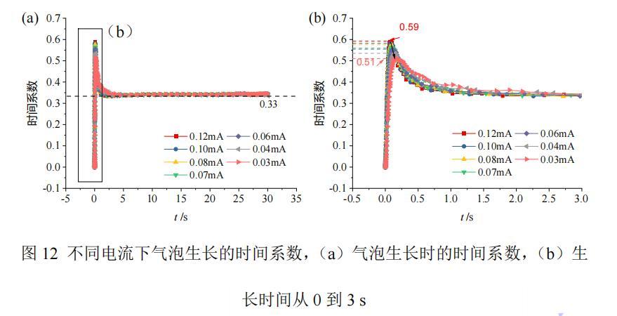 此外,我們比較了不同電流的模擬與實驗中(0.10 mA)氣泡邊界的溶解氧通量,如圖11所示。可以看出實驗中通過氣泡邊界的溶解氧通量圍繞電流為0.06 mA的模擬曲線上下振蕩。這種振蕩是由于實驗中氣泡直徑變化并不是完全平滑的。實際生長的氣泡可能偶爾吸收電極表面直徑為幾個微米的小氣泡導致氣泡的直徑會有一定的突變。但實驗中的通量圍繞電流為0.06 mA的模擬曲線上下振蕩已足以表明模擬結果(0.06 mA)與實驗數據(0.1 mA)的吻合。圖9不同電流下的氣泡直徑圖10光電極表面析氣反應區域的示意圖,(a)小氣泡,(b)大氣泡圖11不同電流的氣泡邊界的溶解氧通量。通過微電極的電流大小主要影響氣泡生長控制方程中的生長系數,而對時間系數的影響相對較小。如圖12所示,不同電流的時間系數都會很快接近0.33,這表明氣泡很快就過渡到只受化學反應控制,電極表面產生的溶解氧全部進入氣泡內部。電流的增大會導致時間系數的尖峰更高,電流為0.12 mA時時間系數的尖峰比電流為0.03 mA時大0.08。