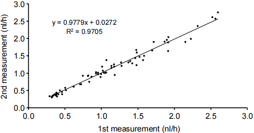 圖4、對同一胚胎進行的第一次和第二次氧氣測量之間的關系,測量間隔為76±8分鐘。