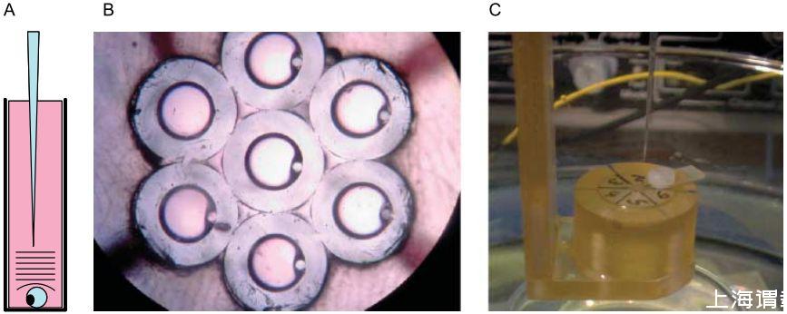 圖2、(A)帶有胚胎的單根花環毛細管示意圖,(B)從上往下看組成“花環”的七根熔融玻璃毛細管,(C)納米吸氣裝置。花環安裝在中央花環盤中,可以旋轉花環盤,使另一根毛細管與電極對齊。圓盤上的數字用于跟蹤正在研究的毛細管。電極位于毛細管上方。承載圓盤的聚砜圓筒和左側的桿是圓盤支架,測量時將其浸入裝有介質的燒杯中。
