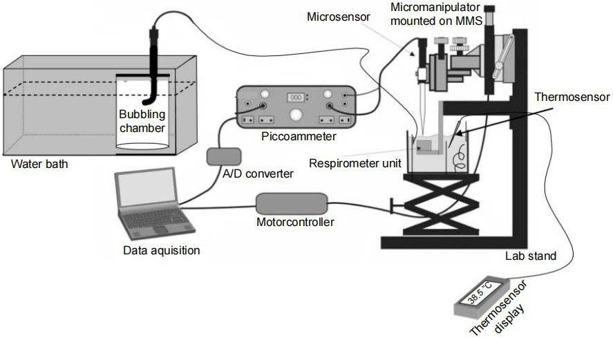 圖1、完整的超微呼吸系統。溫控水浴通過兩根硅膠管(圖中未顯示)與玻璃培養室中的加熱螺旋進一步連接。MMS;微機械手系統。