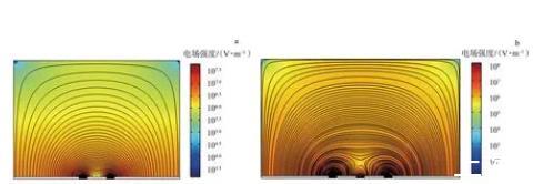 a.單島;b.雙島。圖42種微電極xOz截面的電場分布
