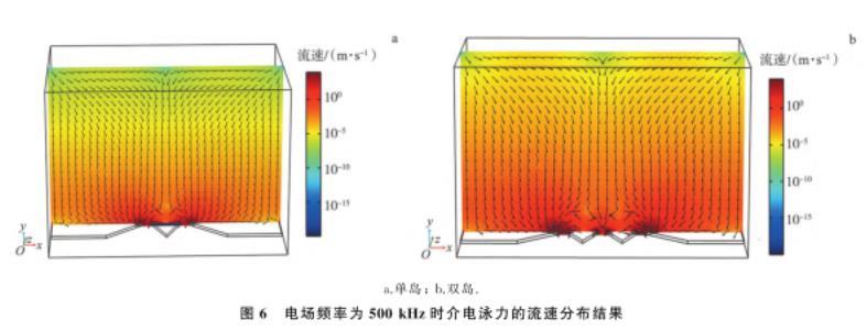 a.單島;b.雙島。圖6電場頻率為500 kHz時(shí)介電泳力的流速分布結(jié)果